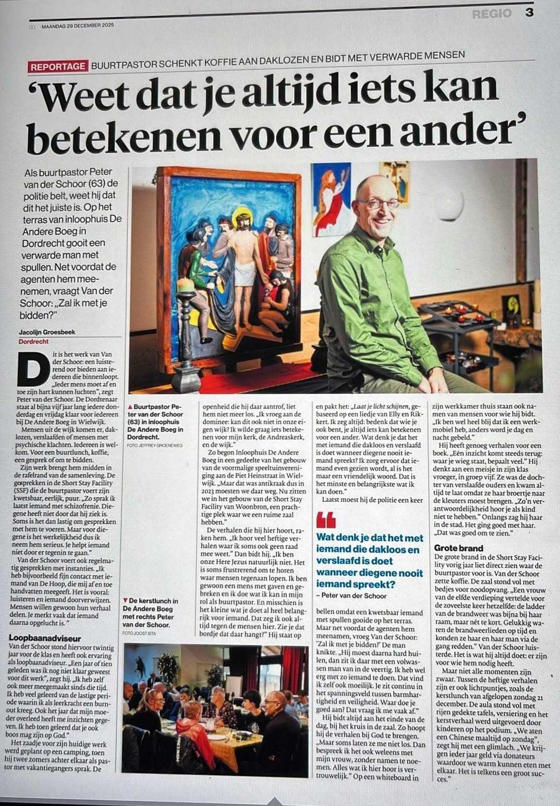 Het was weer gezellig bij de Maand Buurtlunch 🍽🥪 van zondag 23 november jl. in De Andere Boeg. Peter deed een korte overdenking over een Bijbeltekst 📖 uit Spreuken 21 vers 22: “ Wijze mensen kunnen een sterke stad veroveren. Ze breken muren af waarop de inwoners vertrouwden.”🧱Het ging over denkbeeldige muren die er kunnen zijn tussen mensen. Dat mensen niet in liefde ❤️ met elkaar omgaan. En over de bouw van de Berlijnse muur 🧱🪖die uiteindelijk werd afgebroken. Maar voordat deze werd afgebroken waren er veel gebedsbijeenkomsten🙏🏻 en stille tochten 🚶♀️🚶♂️aan vooraf gegaan. Dus wil je muren afbreken? Begin dan met bidden!🙏🏻Dank weer aan de vrijwilligers uit buurt en kerk👏🏻!De volgende maand is de Kerstbuurtlunch! 🎄🌟 Deze is op zondag 21 december om 13:00 uur. Van harte welkom!🤗 Vanwege de te verwachten grote opkomst, is er een inschrijflijst. Er kunnen maximaal 70 gasten aan deelnemen. Dus wees er snel bij! Inschrijven kan tot 13 december.
